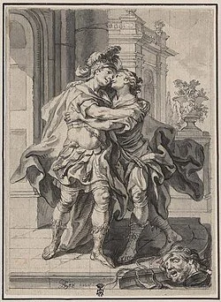 Jonathan greeting David after killing Goliath, 18th century illustration by Gottfried Bernhard Göz